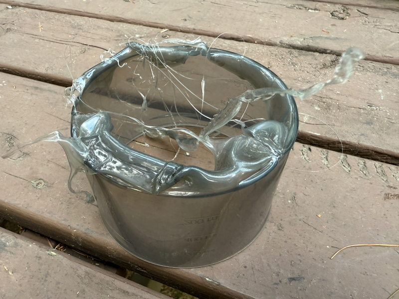 I have a Pocket Rocket Mini Stove Kit. The pot nests into the plastic bowl when packing the kit, and the bowl is almost invisible. I knew when I first saw this that the day would come when I would forget to remove the plastic bowl before putting the pot on the burner. Well, today was the day.