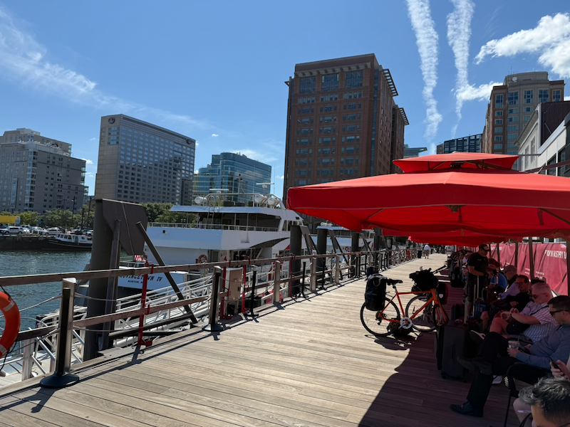 I left the house at 11:30 a.m. and took the Somerville Community Path and other bike lanes to the Provincetown Fast Ferry pier in the Seaport district of Boston (45 minutes, 5.23 miles). A round-trip ticket on the Provincetown Fast Ferry cost $148, including $10 each way for my bicycle.