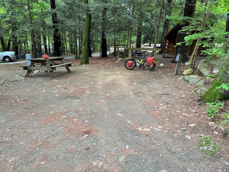 I left at 2:15 p.m. I rode out the Somerville Community Path, Linear Trail, and Minuteman Bikeway to Bedford. Since it had rained the day before, I decided not to ride the unpaved Reformatory Branch Trail to Concord, which I was afraid would be slick and muddy. I took Route 62 through Concord and West Concord; this is a pretty busy road, but it has adequate shoulders, and drivers are used to bicyclists on that road. I rode the Bruce Freeman Trail and Concord Rd to Acton, where I used Apple’s iOS Maps app for route planning. But I missed a turn and ended up on Routes 27 and 110 between Acton and West Acton; both of these roads have heavy traffic, narrow shoulders, and potholes. I finally found a series of back roads that took me smoothly to the campground, where I arrived at 6:00 p.m. after riding 33.73 miles.