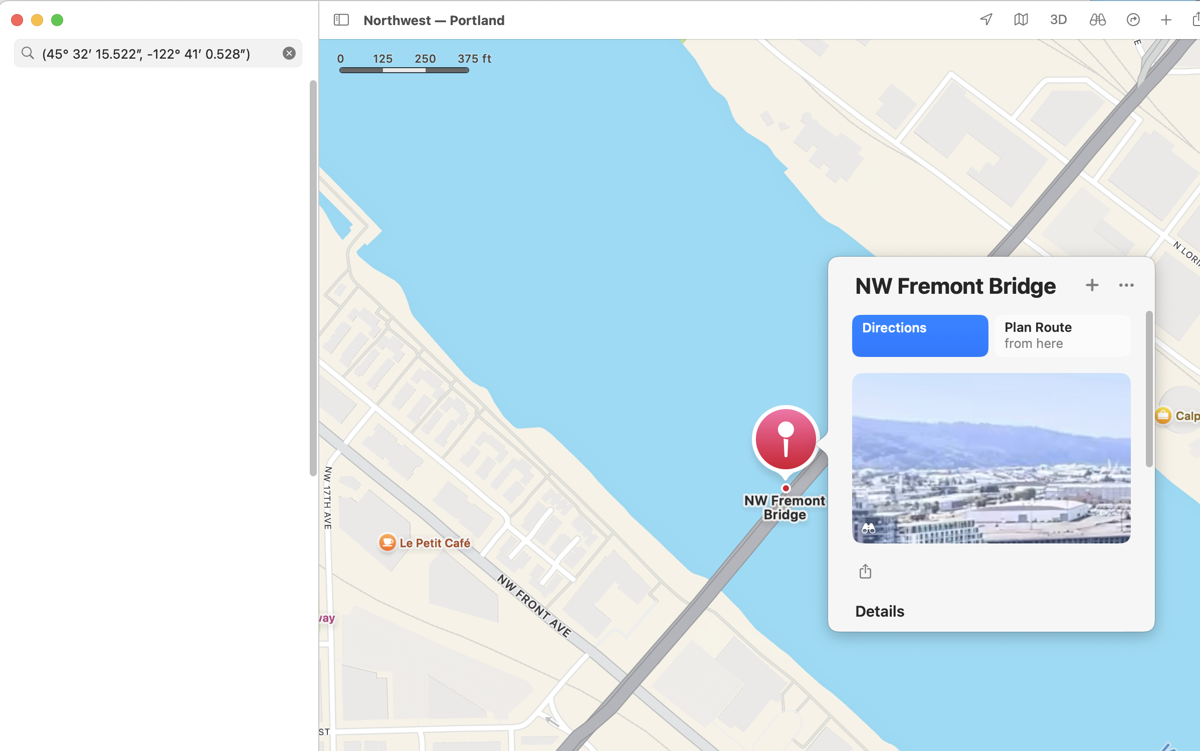You can copy the coordinates, Latitude: 45° 32’ 15.522” N, Longitude: 122° 41’ 0.528” W, reformat them to standardize them as (45° 32' 15.522", -122° 41' 0.528"), and paste them into the Apple Maps application on a macOS computer to view the location on a map.