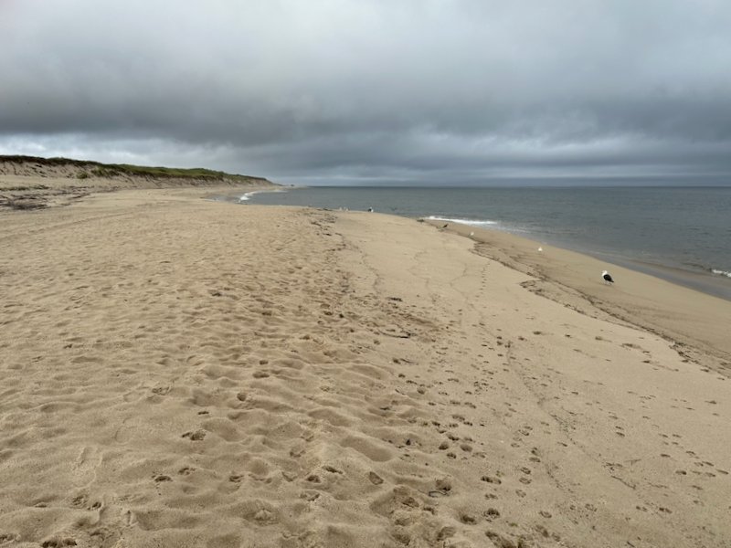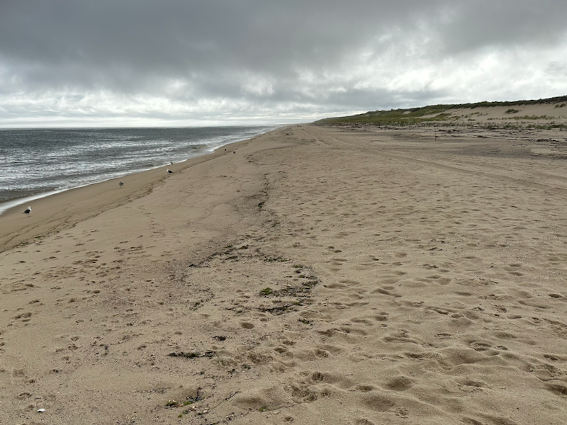 I turned left on Snail Road to return to Route 6. I crossed and continued straight onto the Dune Shacks Trail. Other people were already hiking there. I followed the trail in the sand over several dunes. A sign recommended staying on the main trail. After slow but steady walking in the loose sand, I reached the ocean. I could see a couple of shacks and a 4-wheel road. The beach was very empty. The water was the Gulf of Maine in the Atlantic Ocean.