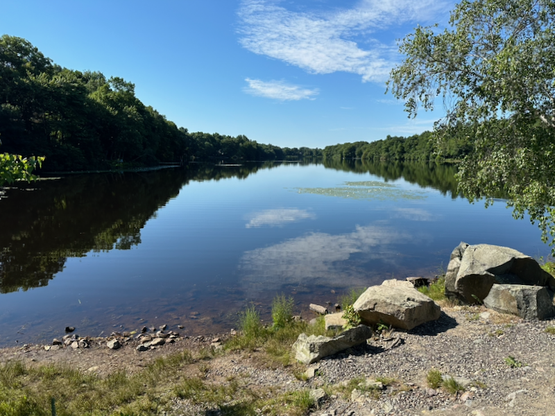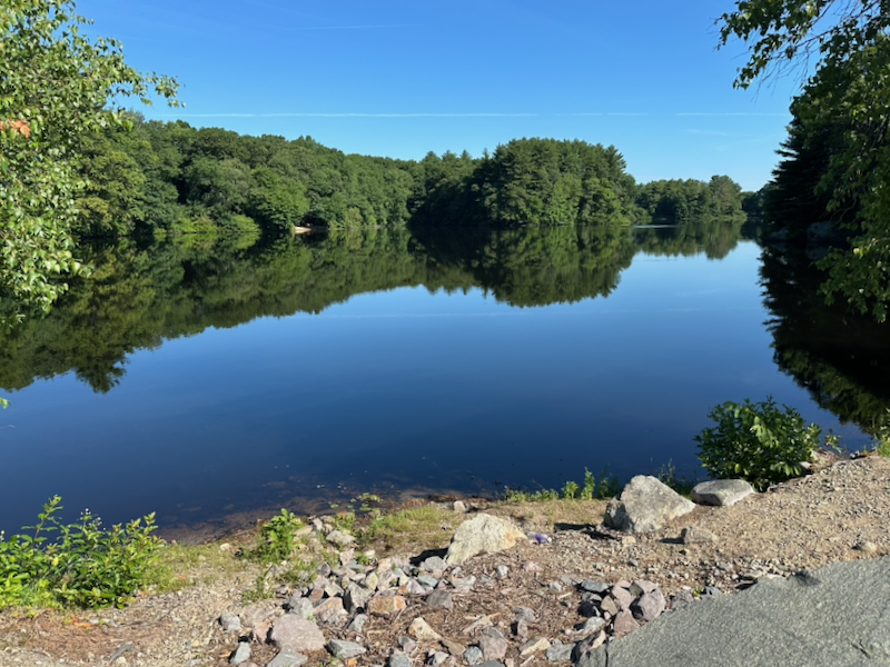 I packed efficiently and left at 7:00 a.m., when the temperature was a cool 62 °F. I managed to navigate safely through some busy intersections on what was otherwise a pleasant ride northbound before reaching Ames Long Pond at 20.5 miles, where the temperature was 75 °F.