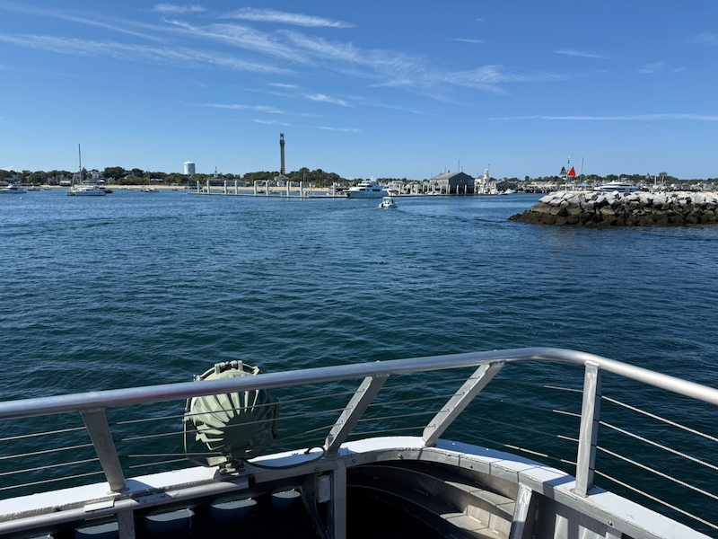 The ferry departed promptly at 1:00 p.m. and arrived at MacMillan Pier in Provincetown at 2:30 p.m. The weather was sunny but windy, and I sat in one of the seats in the bow.