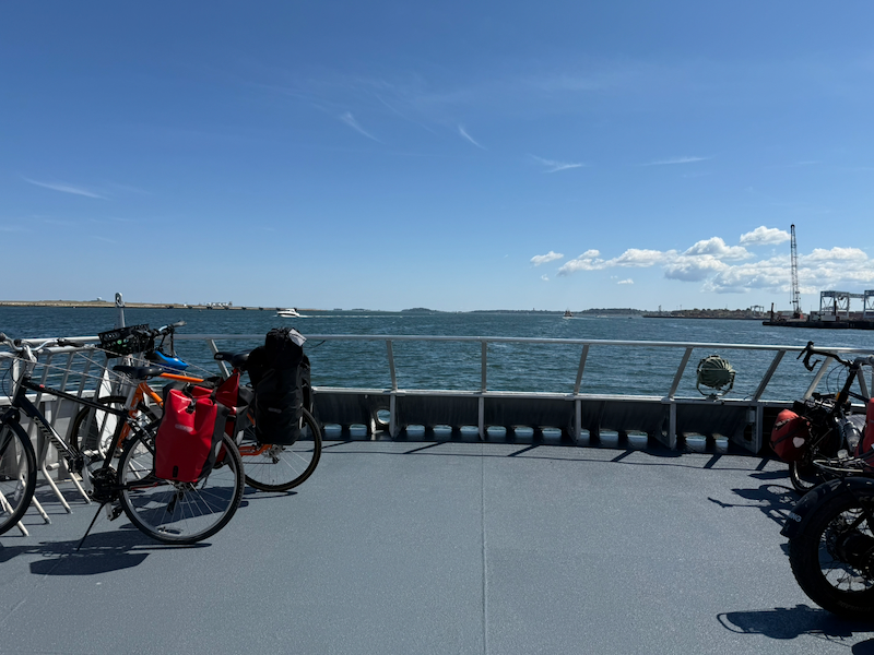After I rolled my bike onto the ferry’s bow, a ferry employee tied it securely to the bike racks. Since my front rack prevented me from inserting my wheel into the bike rack, I leaned my bike sideways against the bike rack. Fortunately, there was plenty of space.