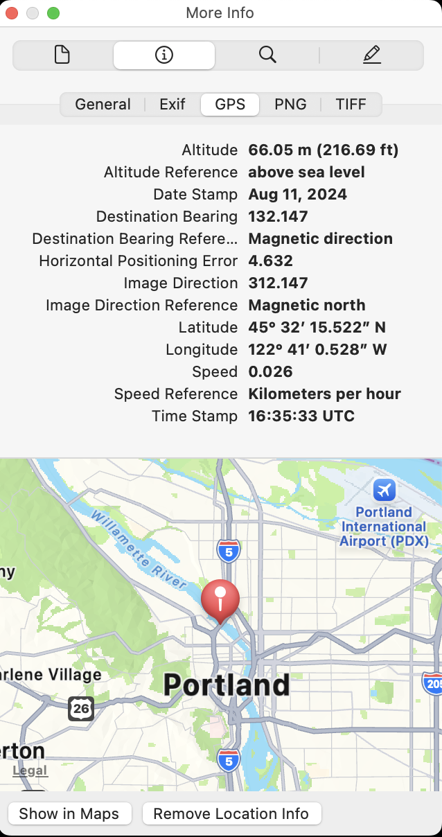 The photo’s GPS coordinates displayed by the macOS Preview app